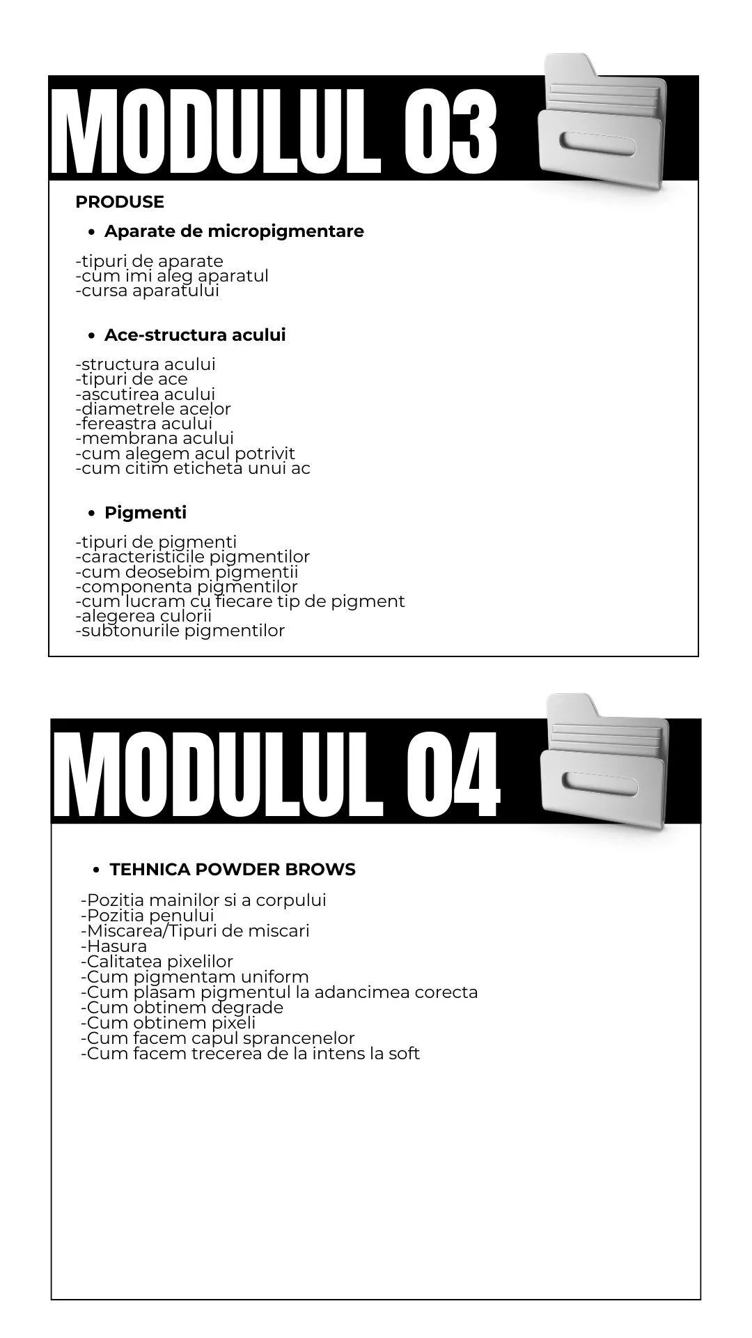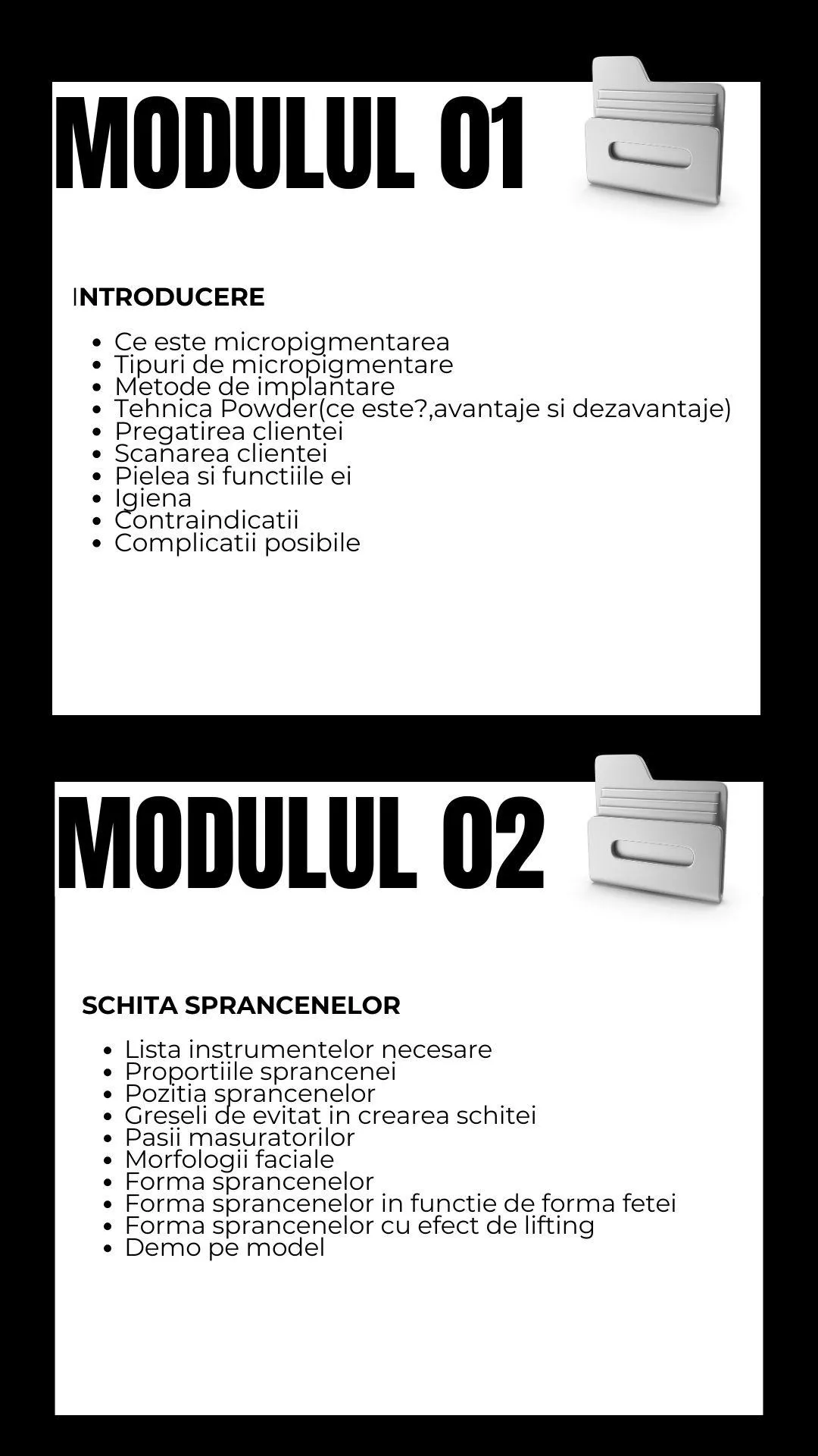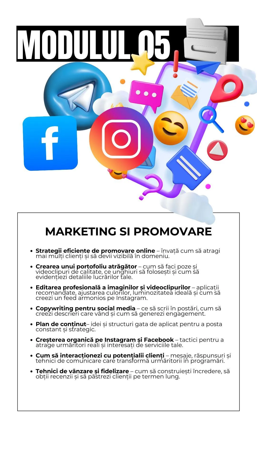 Pe lângă tehnica Powder Brows, programul include și un modul de marketing și promovare, unde vei învăța cum să îți creezi un portofoliu atractiv, să faci poze și video-uri de calitate, să scrii postări care vând și să folosești Instagram și Facebook pentru a atrage clienți.